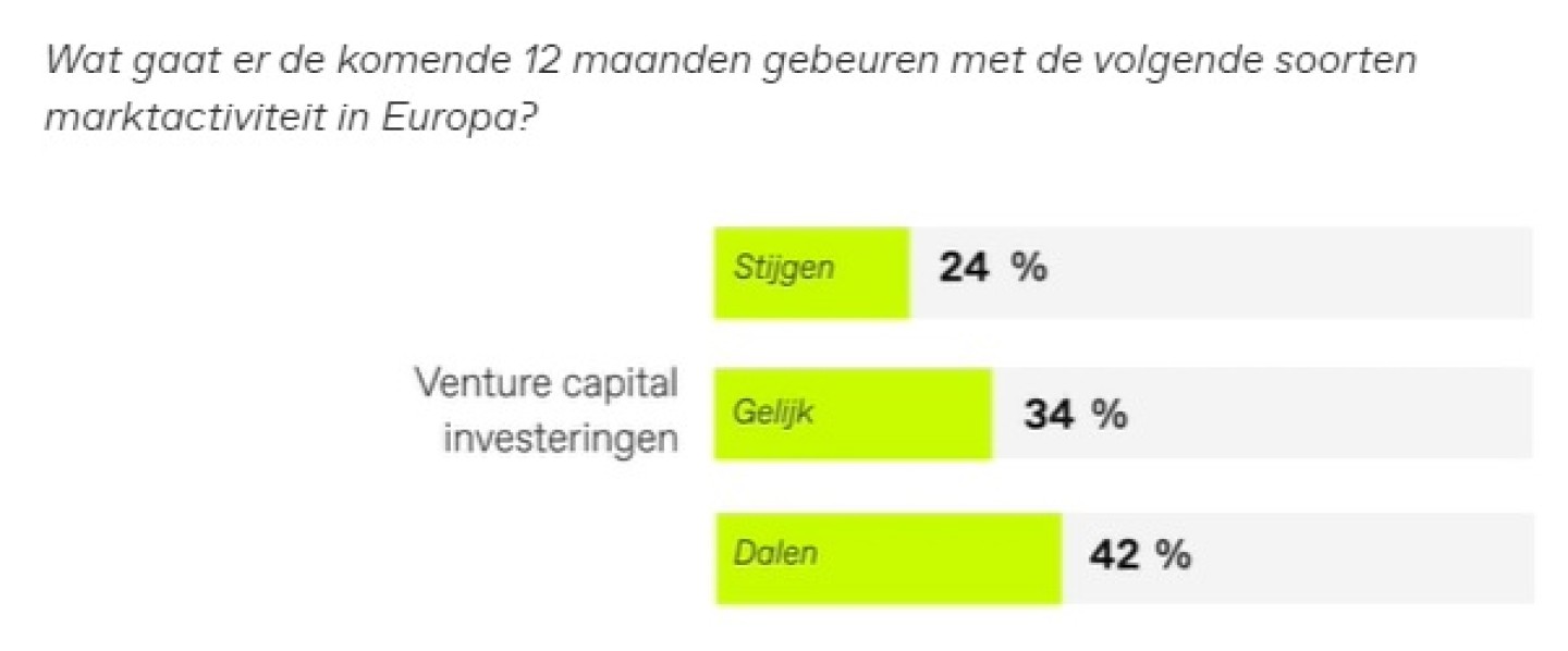 • Veel dealmakers zijn somber over venture capital-investeringen. Die gaan dalen verwachten velen van hen (ruim 42%), of blijven in het gunstigste geval gelijk (34%).