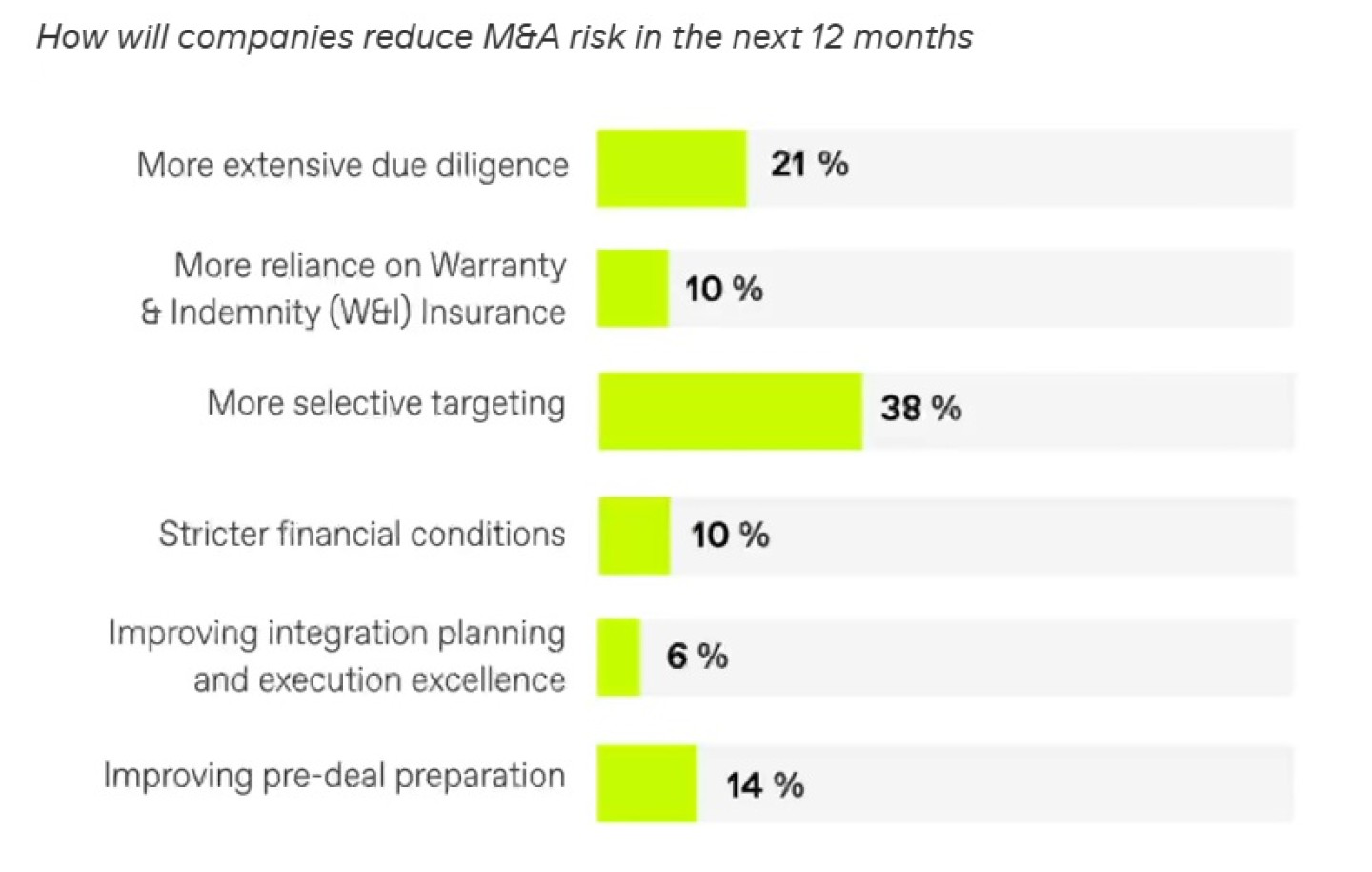 M&A-professionals verwachten de risico’s de komende twaalf maanden vooral te zullen beperken door een selectievere targeting (38 procent), door een grondiger due diligence (21 procent) uit te voeren en door deals beter te voorbereiden (14 procent).