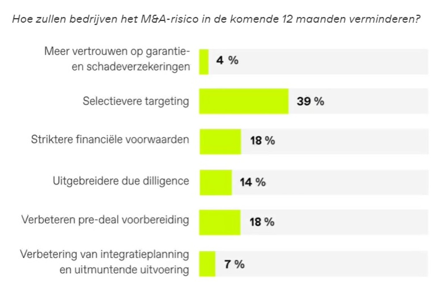 Het verbeteren van pre-deal en integratieplannen scoort met achttien procent ook hoog binnen de M&A Community. Peter Toutenhoofd, Head of M&A Advisory Netherlands bij BNP Paribas: “Verbeteren van integratieplannen zal vanuit corporates heel belangrijk zijn. Goed kijken of de synergiën tangible gemaakt kunnen worden. Verzekeringen om onzekerheden weg te nemen zie ik ook. W&I-verzekeringen zijn een standaard inmiddels in iedere transactie.”