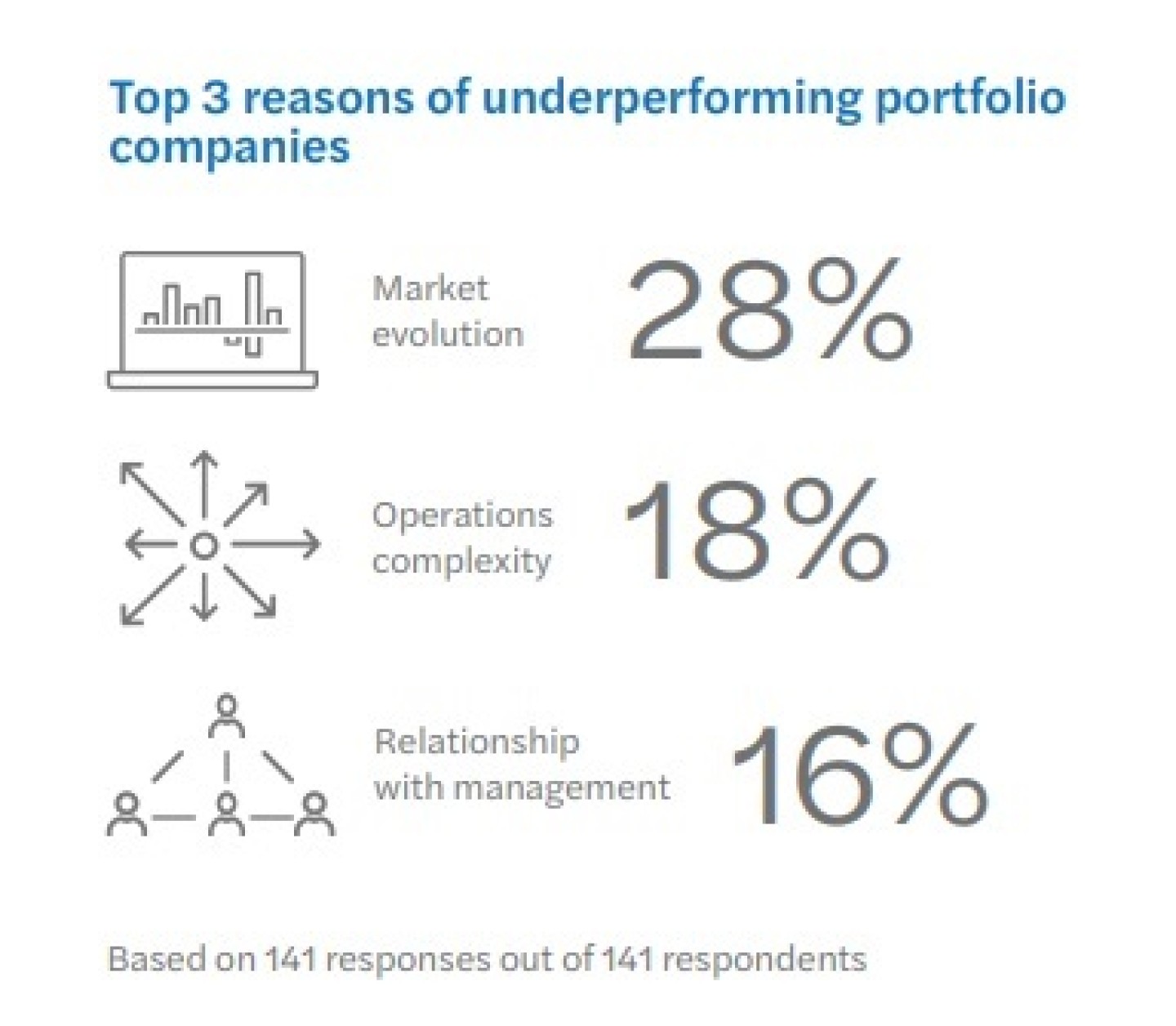 Drie oorzaken van onderpresterende bedrijven Volgens het onderzoek presteert 73 procent van de portefeuillebedrijven zoals verwacht of beter na drie jaar. In de afbeelding hieronder staan de drie redenen die de PE-investeerders aanwijzen als oorzaak van onderpresterende assets.