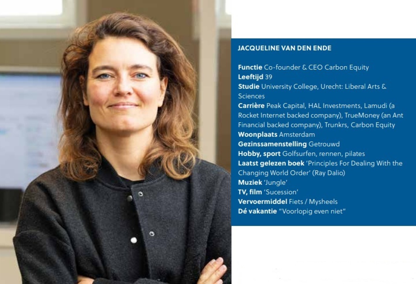 Geld bepaalt wat er in de wereld gebeurt Het moment van inzicht dat voor Jacqueline van den Ende, CEO en co-founder van Carbon Equity, uiteindelijk heeft geleid tot de oprichting van haar bedrijf kwam tijdens het lezen van het boek 'The Sixth Extinction’ van Elizabeth Kolbert. “Ik ben in mijn leven veel bezig geweest met klimaatverandering, maar toen ik dat boek las realiseerde ik mij dat het uitsterven van de mensheid mogelijk, of zelfs waarschijnlijk is, wanneer we hier niets aan doen", vertelt ze. “Dus voor mijn gevoel had het op dat moment geen zin meer om mijn tijd en talent ergens anders aan te gaan besteden. Ik heb toen besloten dat ik de komende dertig jaar van mijn leven wil bouwen aan bedrijven die klimaatverandering helpen oplossen met kapitaal als wapen. Ik geloof namelijk heel erg dat geld bepaalt wat er in de wereld gebeurt.”