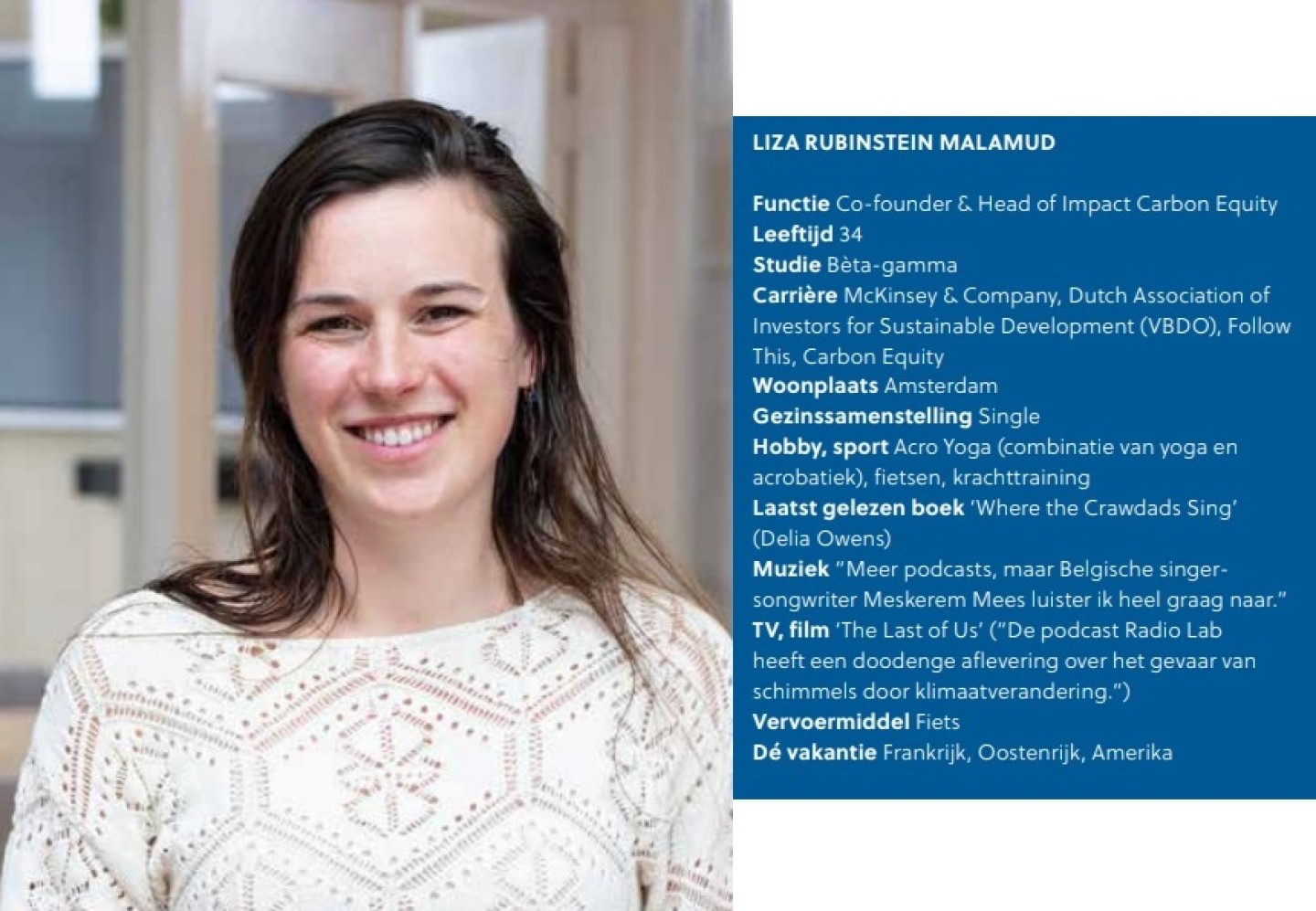 Klimaatverandering is een thema dat ook Liza Rubinstein Malamud, Head of Impact en co-founder van Carbon Equity, al heel lang bezighoudt. Ze werkte bijna vier jaar lang bij McKinsey, waar ze zich voornamelijk richtte op duurzaamheid en de energietransitie. Ze speelde een sleutelrol in het produceren van het McKinsey rapport over ‘decarbonisation pathways’ dat belangrijke input was voor de EU Green Deal. Tijdens haar tijd bij McKinsey begon ze ook te beseffen hoe belangrijk venture capital en private equity zijn voor de transitie naar duurzame energie, maar daar deed het vermaarde consultancy-bureau zelf weinig mee. Toen de kans zich voordeed met Jacqueline en een aantal andere oprichters Carbon Equity te beginnen greep ze die met beide handen aan.