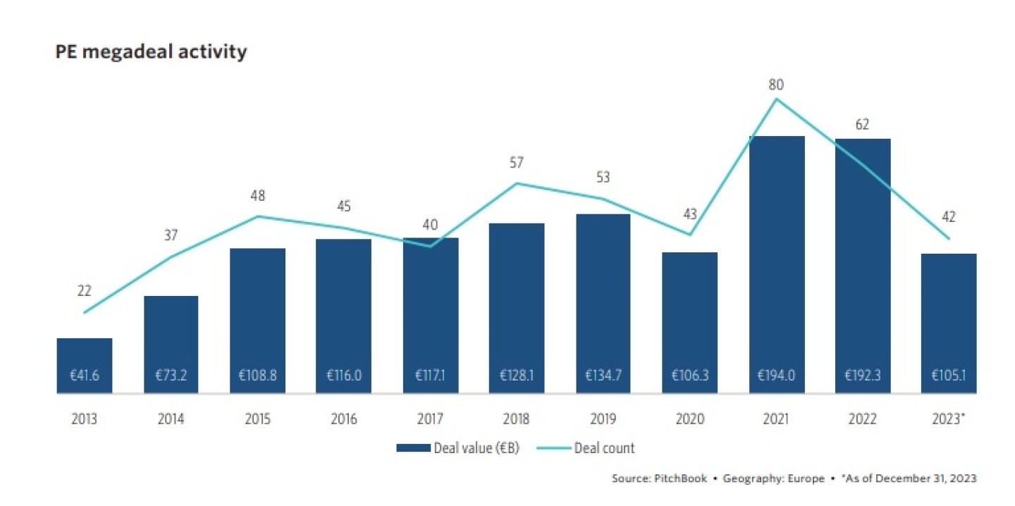 De megadealactiviteit was op het laagste niveau sinds 2014, maar qua fondsenwerving ging het in 2023 juist heel goed. 2023 was zelfs bijna een recordjaar voor private equity-fondsenwerving in Europa wat betreft opgehaald kapitaal.