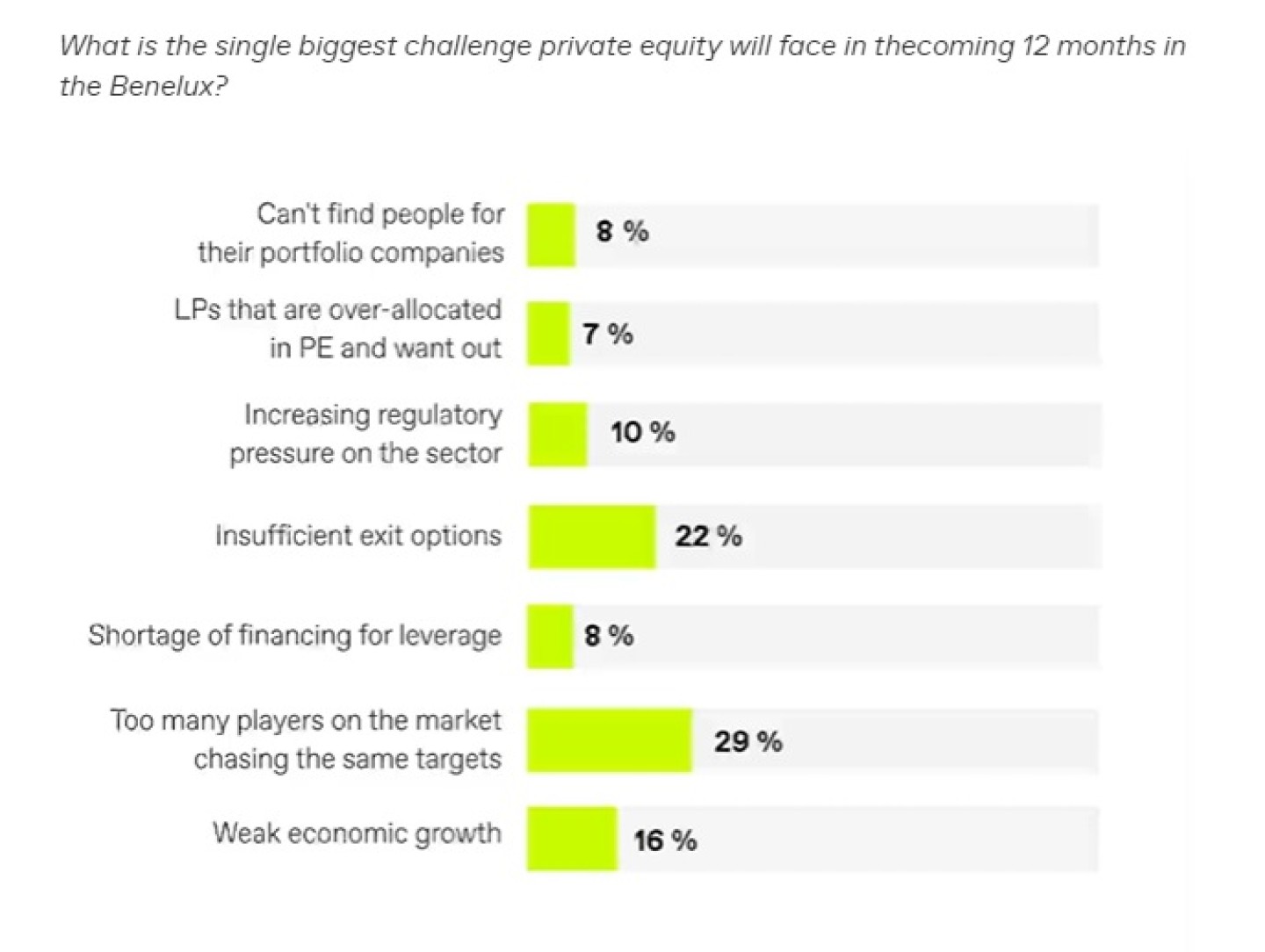 Te veel jagers, te weinig wild Wanneer gevraagd naar de grootste uitdaging voor private equity in de Benelux, springt één antwoord er duidelijk uit, en wel aan de koperskant: te veel spelers die dezelfde targets najagen. 'Overcrowding' van de markt, zoals Sander Neeteson, Hoofd Corporate Finance van ABN AMRO Bank het noemt.