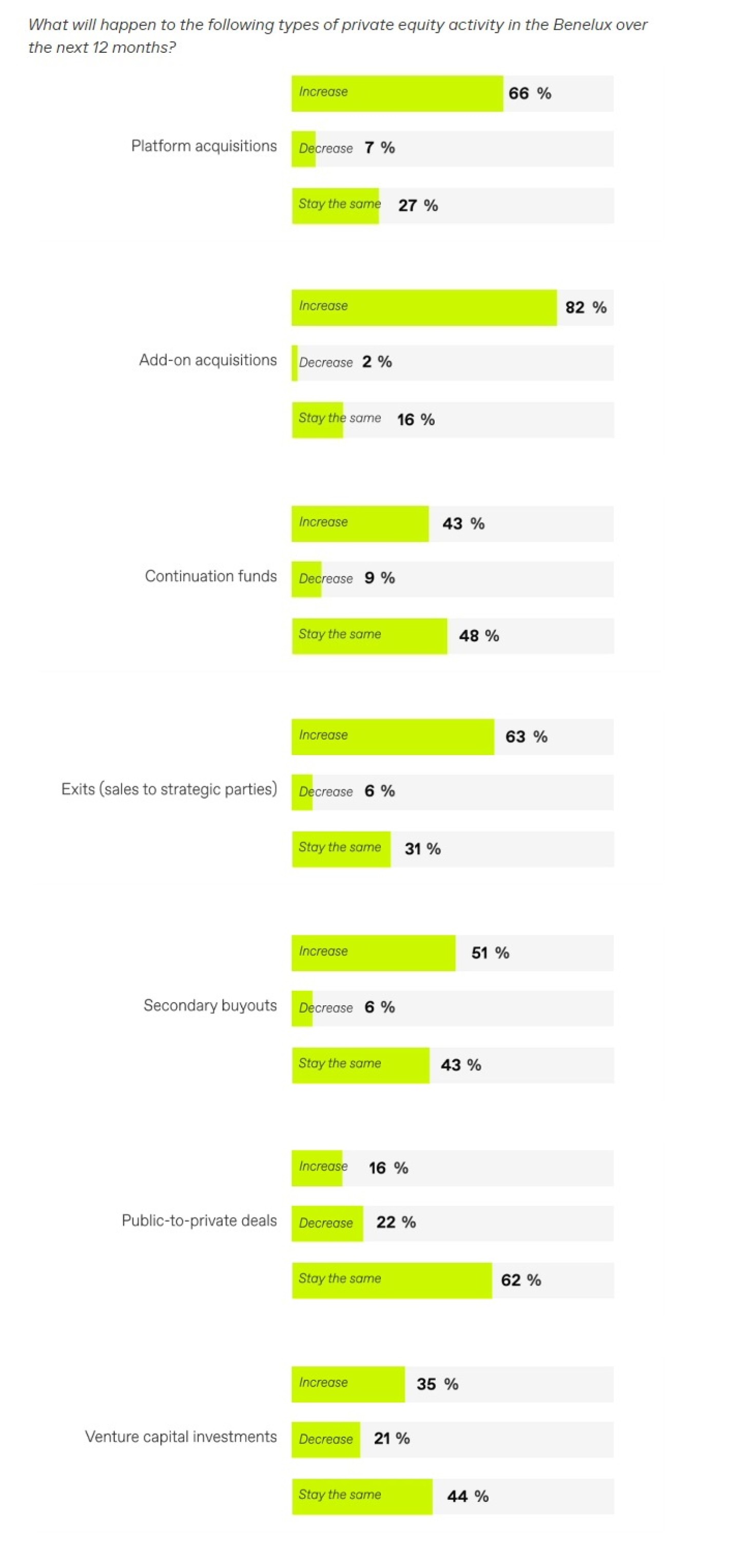 De meeste soorten private equity-activiteiten zullen de komende maanden waarschijnlijk toenemen. Dat blijkt uit het M&A Trendonderzoek Benelux 2024 / 2025 van M&A en Ansarada. Voor dit onderzoek namen 175 Nederlandse en Belgische M&A-professionals deel aan een online survey en interviewde de redactie van M&A 35 dealmakers live.