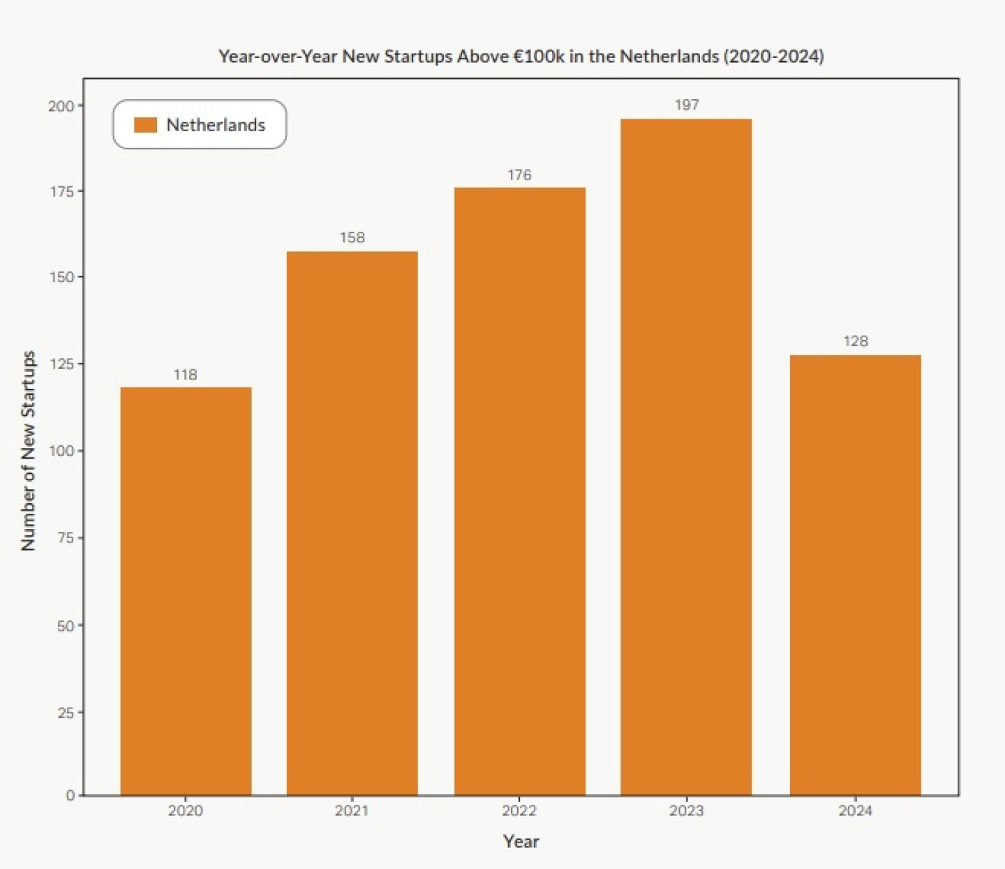 Financiering in de vroege fase blijft een obstakel Het aantrekken van vroege fase-investeringen (tot vijftien miljoen euro) blijft een van de grootste uitdagingen voor startups. Slechts 104 startups wisten meer dan 100.000 euro op te halen, een daling van 23 procent ten opzichte van 2023, toen dit nog 172 startups lukte. Ook het aantal financieringsdeals daalde met twintig procent.